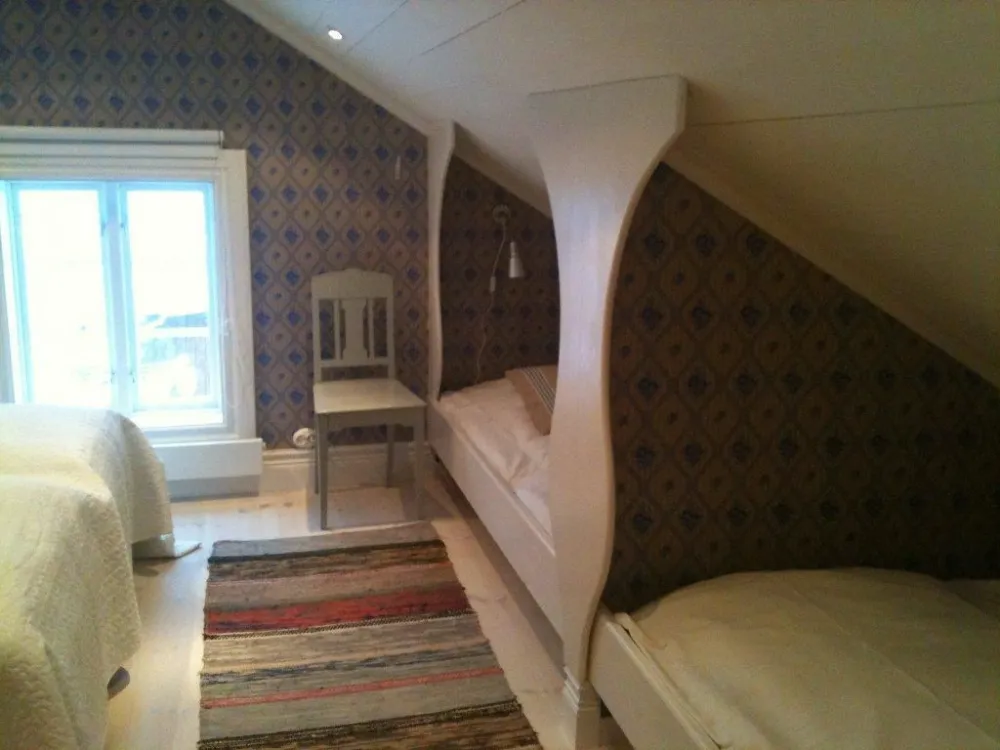 Sovloft: med dubbelsäng och 2 enkelsängar samt inbyggda enkelsängar mittemott dubbelsängen.